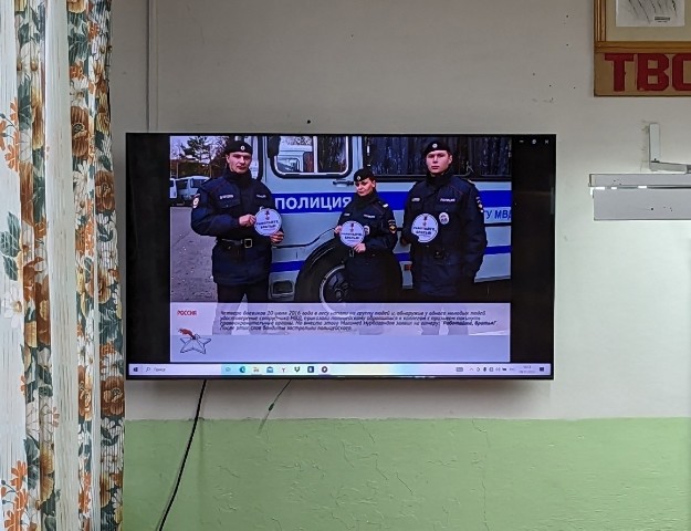 Совместно с Юлией Александровной ребята посмотрели документальный фильм «Один день из жизни полицейского» (основанный на реальных событиях) и социальный ролик «Погибшим при исполнении...», посвящённый бессмертной памяти героев – сотрудников ОВД России, пожертвовавших свои жизни во благо общества.
