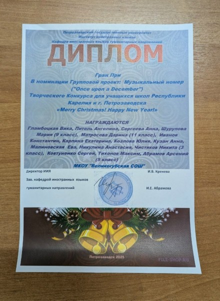 В этом году наша школа впервые приняла участие и представила на конкурс групповой проект – музыкальный номер: песню из мультфильма «Анастасия» «Once upon a December». Эту очень трогательную и красивую песню подготовили учащиеся 9 и 11 классов: Дарина Матросова, Виктория Гламбоцкая, Анна Сергеева, Ангелина Питель, Мария Шурупова!