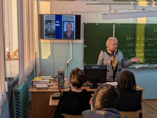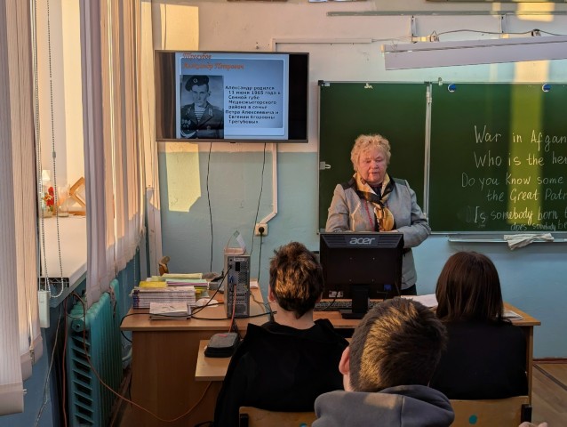 Советник по воспитанию Юлия Александровна Карпина совместно с учителем английского языка Надеждой Ивановной Кабановой провели для учащихся 8 класса час Памяти «Портрет героя моей малой Родины».