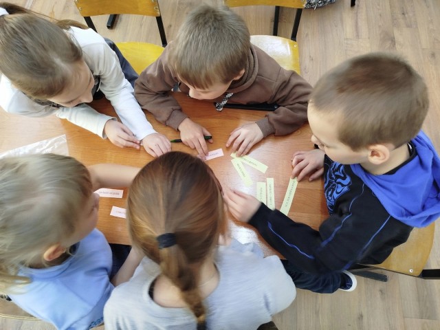 В командной работе ученики показали отличное знание русских пословиц и дружно собрали из разноцветных пластиковых крышечек слово «ученик».
